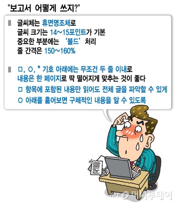 보고서 양식에는 몇 가지 원칙이 있다. 글씨체는 휴먼명조체를 써야 한다. 글씨 크기는 14~15포인트가 기본이다. 장관보고에는 16포인트로 할 때도 있다. 중요한 부분에는 '볼드'처리를 해야 한다. 줄 간격은 150~160%까지는 줄일 수 있다. 글자 간 간격과 여백에도 기준이 있다.