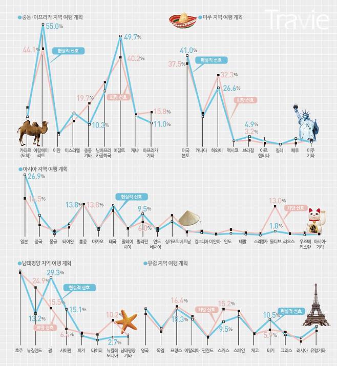마음은 유럽에, 몸은 아시아에아무 조건 없이 가장 가고 싶은 여행지는 유럽23.3%이지만 실제 시간이나 비용을 고려해서 여행할 목적지를 묻는 질문에서는 아시아32.2%가 뽑히는 대역전이 일어났다. 역시 유럽은 여행자의 로망이 담긴 스테디셀러고 아시아는 가까워서 좋고, 한결같이 편안한 여행비상구다.