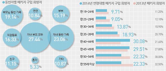 40대 L씨는 패키지 가족여행을 고른다이번 여름 휴가에 L씨는 패키지여행상품13.9%을 이용할 계획이다. 그가 생각하는 패키지여행상품의 장점은 뭐니 뭐니 해도 알아서 다 해 준다52.46%는 것. 현지 언어와 교통에 자신이 없으니17.59% 여행사의 도움을 받는 편이 낫다. L씨 같은 40대59.59%들에게는 아무래도 패키지 상품이 편한데다가 자녀동반23.06%이거나 부모와 자녀 모두 동반27.44%해서 여행하게 되는 경우가 많기 때문. 그렇다 보니 동일상품의 가격을 10만원 이상 저렴하게 판매하는 여행사가 있다면 업체를 바꿀 의향54.6%이 크다. 하지만 L씨처럼 패키지 상품을 선호하는 여행자 숫자는 2009년 이후 매년 줄어들고 있는 추세다.
