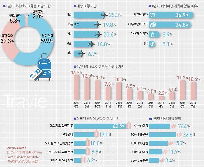 대한민국 평균 여행자 K씨K씨는 올해 8월14.5%에 해외여행을 갈 예정이다. 2013년에는 추석 황금연휴가 있어서 9월에 해외여행을 다녀왔지만 올해는 역시 여름휴가 기간을 선택했다. K씨의 여행 예상기간은 4일14.8%~5일25.3%. 그러나 패키지 상품13.9%을 이용하기보다는 에어텔 상품43%을 고려하고 있다. 가능하면 항공과 숙소를 직접 예약26.1%하려는 의사도 있는데, 비용이 상대적으로 저렴한 LCC저비용항공사 이용66.9%도 긍정적이다. 가고 싶은 여행지는 유럽23.3%이지만 시간과 예산 때문에 실제로는 아시아32.3%로 여행지를 결정했다. 예상하는 여행 지출 경비는 100~149만원 사이22.6%다.