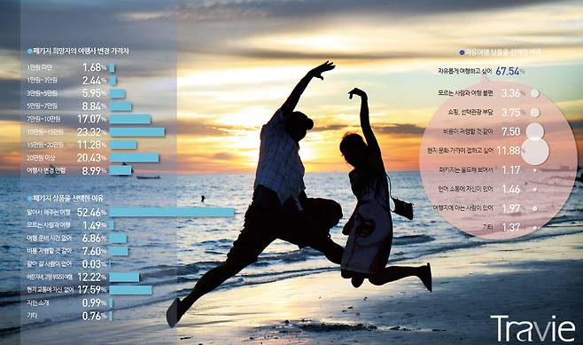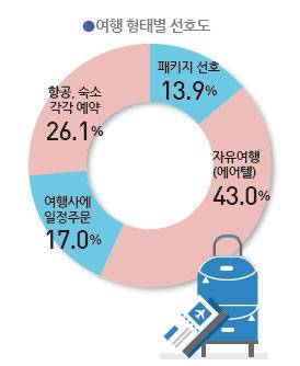 20대 P씨는 자유여행을 떠난다P씨 같은 20대의 경우 패키지여행을 떠나는 경우는 열에 한 명이 될까 말까다. 패키지의 경우 가격이 저렴하다7.5%는 장점이 있긴 하지만 여행사를 통하더라도 에어텔 등 부분적인 자유여행 상품을 구입42.99%하거나 아예 항공사, 숙박업체를 개별적으로 예약26.13%하는 경우가 많다. 무엇보다 일정에 얽매이지 않고 자유롭게 여행67.54%하고 싶기도 하고, 현지 문화를 가까이 접할 수 있다11.88%는 매력 때문에 자유여행을 더 선호한다.
