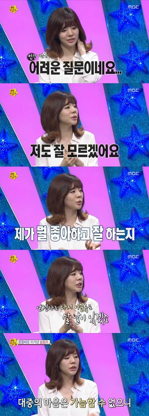 써니는 최근 무대와 방송을 오가며 화려한 전성기를 누리고 있지만 이날 방송에서 팬들조차 자세히 알 지 못 했던 허심탄회한 속내를 고백해 안타까움을 자아냈다. 대중의 관심 속에서 홀로 겪은 슬럼프를 고백하고 인간 이순규로서의 미래에 대한 고민을 털어놓은 것.