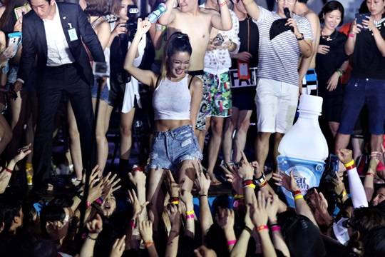 이번 비키니 파티에서 윤지는 날씬한 사람만 통과할 수 있도록 제작된 비키니 라인을 가볍게 통과했고 자신의 곡 'If you love me'에 맞춰 자신의 비키니 몸매 관리 비결인 팻다운 복근 댄스를 춰 현장을 달궜다.풀장 위에서는 자신의 당당하고 자신감 있는 몸매 비결인 다이어트 워터 팻다운 아웃도어를 비키니 풀 파티어들에게 선물하는 시간을 가졌다. (사진=CJ제일제당 제공)