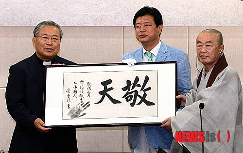 【서울=뉴시스】조성봉 기자 = 4일 오전 서울 중구 명동 천주교 서울대교구 대회의실에서 열린 안중근(토마스) 의사 유묵 '경천(敬天')' 기증식에서 염수정(왼쪽) 추기경이 안 의사의 붓 글씨 '경천'을 박삼중 스님에게 전달받고 있다. 왼쪽에서부터 염수정 추기경, 잠원동 성당 김종박 사목회장, 박삼중 스님.