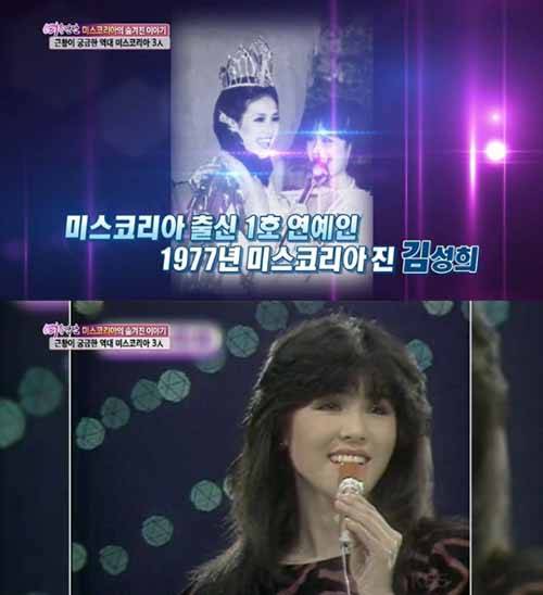 이날 방송에서 출연자들은 '근황이 궁금한 역대 미스코리아 3인'이라는 주제로 이야기를 나눴다. 이 3인에는 김성희 장윤정 궁선영이 꼽혔다.먼저 연기자 가수로 왕성하게 활동했던 김성희의 근황이 소개됐다