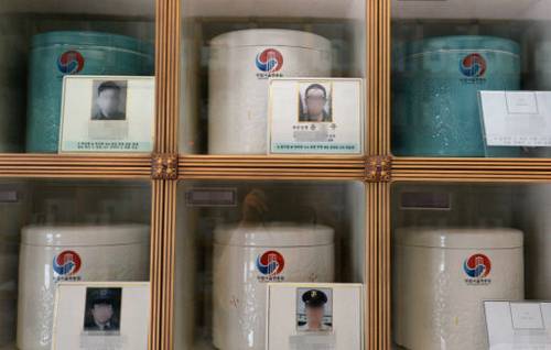 | 이제는 편안하길… 선임병들의 집단 구타 끝에 사망한 육군 28사단 윤모 일병의 위패(위쪽 가운데)가 7일 국립서울현충원 충원당에 안치돼 있다.이재문 기자 |