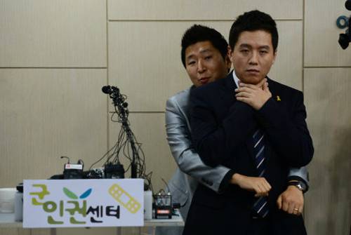 | 기도폐쇄 때 구호법 시연 임태훈 군 인권센터 소장(앞쪽)과 김대희 운영위원이 7일 오전 서울 영등포구 군 인권센터에서 윤 일병 사건 관련 브리핑을 하면서 기도폐쇄 때 시행하는 하임리히법을 시연하고 있다.남정탁 기자 |
