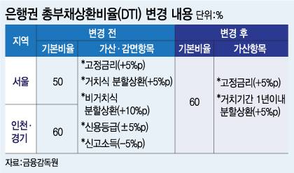 DTI 가산항목은 △고정금리 5%포인트 △거치식 분할상환 5%포인트 △비거치식 분할상환 10%포인트 △신용등급 5%포인트 등이다. 즉 가산항목이 적용되면 서울은 65%, 경기·인천은 75%까지 적용돼왔다.