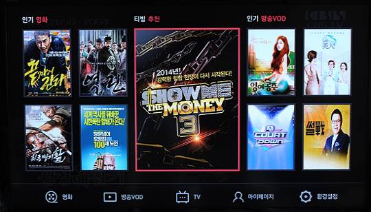 첫 화면은 인기 영화, 티빙 추천, 인기 방송 VOD 등 3가지 카테고리로 단순화 했다. 리모콘의 방향키를 움직이면 빨간 테두리선이 옮겨다닌다. 화면 백그라운드에는 TV 화면이 옅게 깔려 있다. 실시간TV가 된다는 느낌이 든다.