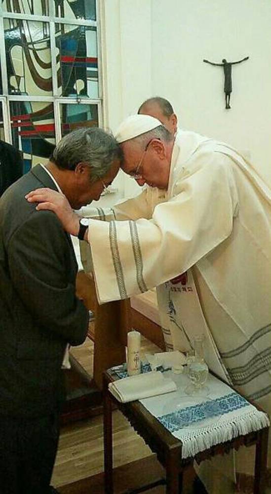 프란치스코 교황이 17일 오전 서울 종로구 궁정동 주한교황청대사관에서 세월호 참사로 숨진 단원고 학생 고(故) 승현 군의 아버지 이호진씨에게 세례 성사를 하고 있다. 세례명은 교황과 똑같은 프란치스코다. [사진공동취재단] |