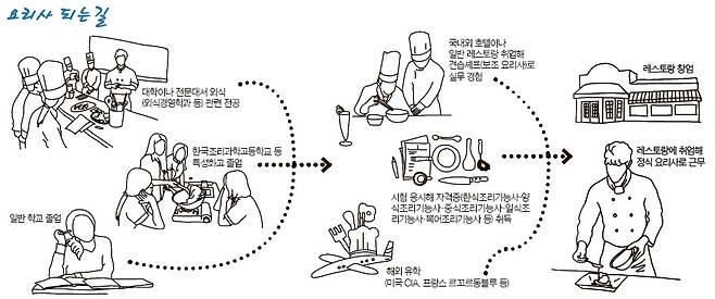 요리사가 되는 한가지 방법은 대학에서 외식관련 전공을 하는 거다. 서울과 수도권 4년제 대학 가운데 외식 관련 학과를 개설한 곳은 세종대·경희대·경기대가 있다. 그 중 세종대는 국내외 인턴십 제도가 있어 학생들이 다양한 경험을 할 수 있다.