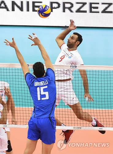 epa04377331 Emanuele Birarelli (L) of Italy tries to block the ball against Adel Gholami (R) from Iran during the match between Italy and Iran in group D the FIVB Volleyball Men's World Championship Poland 2014 at the Arena Krakow, in Cracow, Poland, 31 August 2014. The Championship will be held in Poland from 30 August to 21 September. EPA/JACEK BEDNARCZYK POLAND OUT