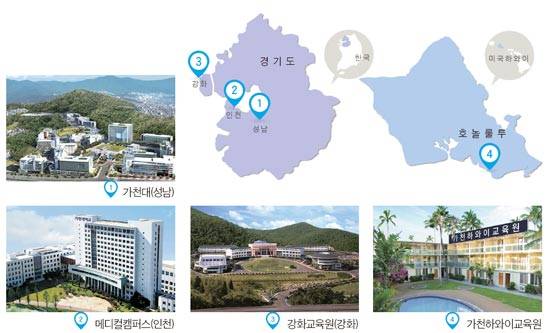 가천대는 현재 2개 캠퍼스와 2개 교육원 체제를 갖추고 있다. 가천대(성남)는 정보통신·바이오나노·의료관광 분야에, 가천대 메디컬캠퍼스(인천)는 의료보건 분야에 각각 특성화돼 있다. 미국 하와이주에 있는 가천하와이교육원에서는 기숙형 어학연수 프로그램을, 강화도 강화교육원에선 가천토익캠프를 각각 진행한다.
