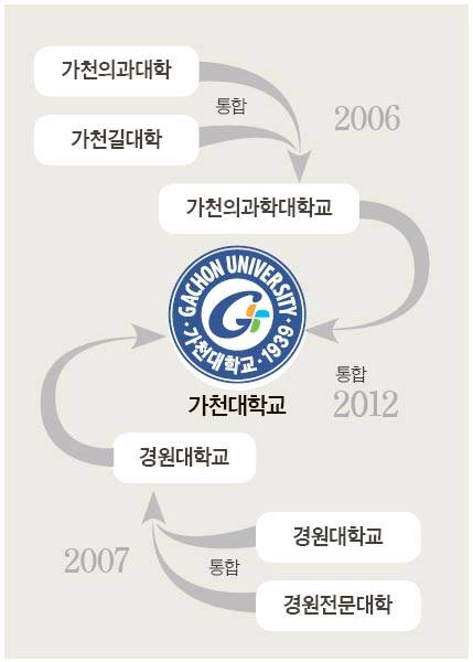 가천대는 4개 대학의 7년 통합 과정을 거쳐 탄생했다. 2006년 3월에 4년제 가천의대와 전문대인 가천길대학이 합쳐 가천의과학대가 됐다. 2007년 3월엔 4년제 경원대와 경원전문대가 경원대로 통합됐다. 이어 2012년 가천의과학대와 경원대가 하나가 돼 지금의 가천대가 된 것이다. 이 과정을 이길여 가천대 초대 총장이 진두진휘했다.