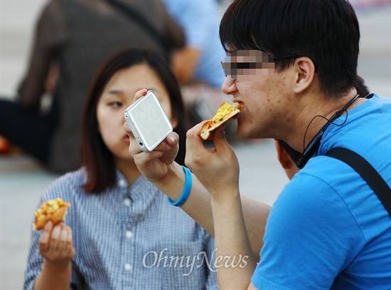 | ▲ 일베 회원등이 세월호 진상규명 특별법 단식농성장 앞에서 '도시락 나들이' 등 먹거리 집회를 예고한 지난 6일 오후 서울 광화문광장 세종대왕상 앞에서 한 남성이 피자를 먹고 있다. |
