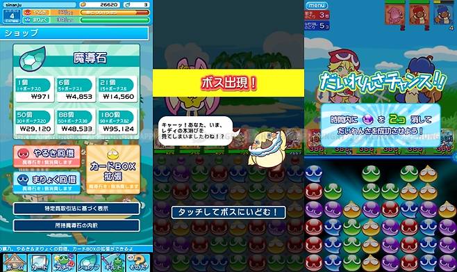 오히려 과금보다 자신의 팀에서 효율적인 공격을 뽑아낼 수 있는 뿌요를 찾는 것만 기억하면 된다. 친구를 포함해서 여러 명의 캐릭터가 함께 싸우는 방식이라 강화는 필수. 여유가 된다면 틈틈이 강화를 해놓는 것도 게임을 현명하게 즐길 수 있는 팁이다.