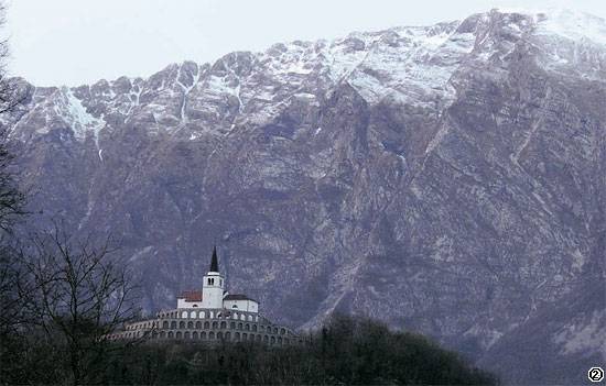 ② 이탈리아군 납골당 교회와 험악한 줄리안 알프스 산세. 코바리드의 상징 풍광.