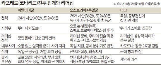 11 차 이손조 전투는 합스부르크 제국의 노쇠함도 드러냈다. 오스트리아 황제 카를 1세는 지원을 요청했다. 독일 카이저(빌헬름 2세)는 응답했다. 그 무렵 러시아는 볼셰비키혁명으로 시끄러웠다. 동부전선의 변화는 재배치를 가능하게 했다. 독일군은 중부전선에 처음 뛰어들었다. 합동 14군(독일 7개+오스트리아 8개 사단)이 신설됐다. 전력은 외형상 비슷했다. 이탈리아군은 34개(40만 명) 사단과 포 2485문을 가졌다. 반대편(독+오스트리아·헝가리)은 35개(35만 명) 사단에 포 2430문. 이제부터 리더십 역량과 전략적 상상력, 전쟁 의지가 승패를 가른다. 헤밍웨이의 감수성은 정밀해진다.