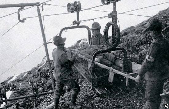 줄리안 알프스(3000m 이하)는 스위스 쪽 알프스보다 낮다. 산세는 그쪽보다 험악하다. 양쪽 군대는 산 암벽에 참호를 팠다. 겨울엔 폭설과 혹한, 눈사태에 시달렸다. 아이젠, 눈신발, 삽, 고글이 눈에 띈다. 노새 편자도 미끄럼 방지용이다. 케이블카는 대포, 탄약, 식량, 부상자를 산꼭대기로 나른다. "서부전선 흙에 떨어지는 포탄과 달랐다. 알프스의 날카로운 돌 파편은 치명상을 입혔다."(『1차 세계대전』 R.G. 그란트 지음). 양쪽 모두 상대방을 증오했다. 오스트리아는 이탈리아의 동맹 탈퇴를 배신으로 여겼다.