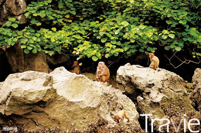 신비로운 고립 원숭이섬 HANG LUON병풍처럼 둘러싸인 섬 한쪽에 낮고 좁은 구멍이 있고 그 사이로 작은 배 또는 카약 등을 타고 겨우 들어갈 수 있다. 안쪽에 들어서면 섬 사이로 호수처럼 넓고 둥그런 공간이 나오는데 한쪽에 원숭이들이 모여 살고 있다. 준비해 간 사과 조각을 던지면 원숭이들이 가까이 다가와 먹이를 먹는다. 물결은 잔잔하고 기암절벽과 그 위로 푸른 나무들이 아름답다. 원숭이를 보러 들어가지만, 섬의 중심에 들어가 잔잔한 바다 위로 떠 가는 경험이 더 이채롭다. 중앙쯤에서 박수를 치면 그 소리가 메아리쳐 들려온다. 바닷물의 수위가 올라가면 들어갈 수 없는 곳이다.