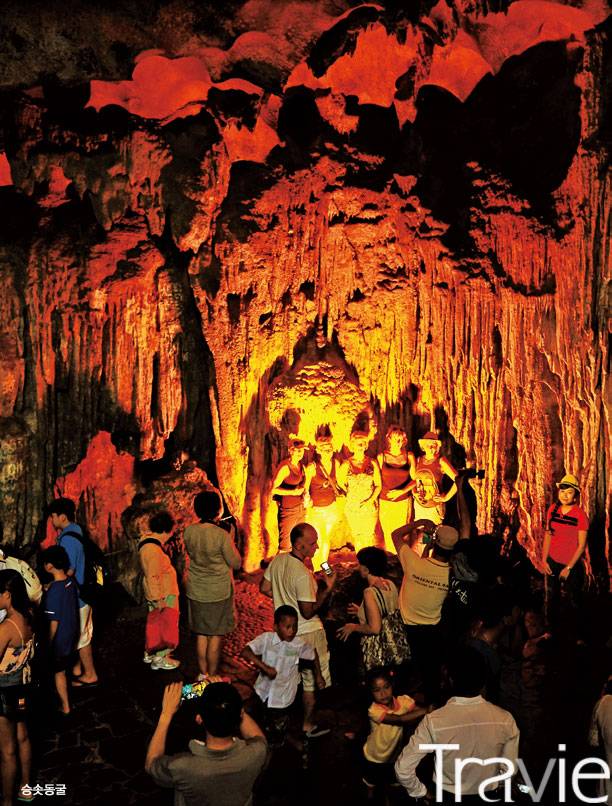 전설이 깊은 승솟SUNG SOT동굴하롱베이의 섬 속에 있는 동굴이다. 무인도에 원숭이가 살고 있는 것을 이상히 여긴 어부에 의해 1993년 우연히 발견되었다. 유람선에서 작은 목선으로 갈아탄 후 섬에 내려 조금 걸어 오르면 동굴 입구가 나온다. 스피드보트 등으로 동굴만 관람하는 코스도 있다. 길이가 100m를 넘을 정도로 넓고 긴 석회암 동굴인데 다른 동굴과 달리 석회암이 위로 자란다 하여 솟아오른다는 뜻의 '승솟'이라는 이름을 얻었다. 오랜 시간 석회암이 자라고 변형되며 기묘한 풍경을 이루었다. 가이드가 곳곳에 서서 동굴 벽을 향해 레이저 포인터로 동그라미를 그리며 닮은 형상을 설명해 준다. 천궁동굴天宮洞窟이라고도 불린다.