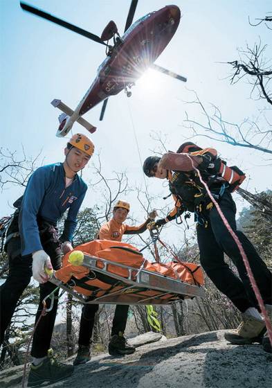 1. 북한산 백운대에서 실족해 발목이 골절된 환자를 산악구조대가 헬기로 이송하고 있다. [사진 북한산 산악구조대]