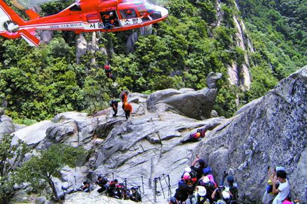 ▶길이 아니면 가지 마라=지난 7일 서울 모 산악회 소속 15명이 출입금지구역인 설악산 둔전계곡 산행 중 안전장비 없이 5m가량의 암벽을 올라가다 미끄러지면서 추락해 한 명이 허리를 다치는 사고가 발생했다. 전화마저 연결이 안 돼 일행 중 한 명이 4시간을 걸어와 구조를 요청했다. 구조대가 현장에 도착한 시간은 오전 2시. 사고 지점이 낭떠러지 옆이라 야간구조는 엄두도 낼 수 없는 상황이었다. 산행객과 구조대 20여 명은 현장에서 비바크를 해야 했다. 결국 이튿날 헬기를 타고 하산했다.