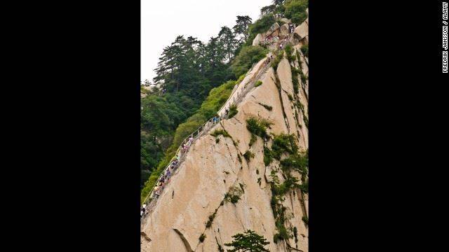 화산 계단(중국) 중국 화산에 오른 사람 중 심장마비가 온 사람 수는 알려지지 않았다는 말이 있다. 수많은 사람들이 이곳을 오르려다가 현기증을 느끼고 아래로 떨어졌기 때문이라는 우스개가 있다. 원래의 '하늘 계단'은 너무 위험해 폐쇄되었고 현재는 판자로 된 계단이 새로 설치돼 있다. 예전과 달리 높은 난간이 있어 사람들은 난간을 잡고 정상으로 오른다.