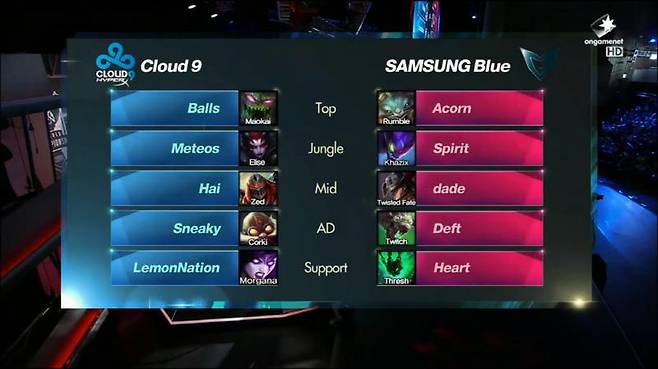 1세트 완파를 당한 삼성 블루와 기세를 높인 클라우드나인(이하 C9)의 8강전 2세트. 삼성 블루는 탑라이너 '에이콘' 최천주가 럼블을, 미드라이너 '다데' 배어진이 트위스티드페이트(이하 '트페')를 택하며 전략보다는 안정성을 택했다.