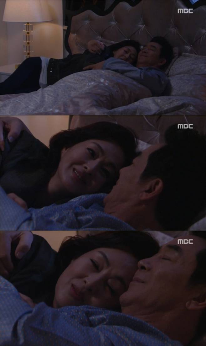 이에 서은하는 조장훈 곁으로 다가갔고 조장훈은 이런 아내를 안고 행복해하는 모습으로 신혼부부 못지않은 닭살 애정행각을 벌였다. (사진=MBC 일일드라마 '압구정백야' 9회 한진희 이보희 캡처)