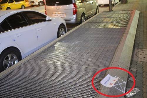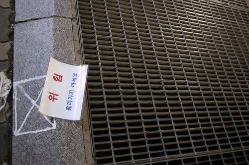 | 서울 광진구 한 지하철역 환풍구 옆에 '위험 : 올라가지 마시오'라고 적힌 종이를 붙였으나 환풍구 면적에 비해 너무 작아 거의 눈에 띄지 않는다. |