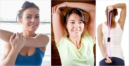 - 두 어깨를 동시에 으쓱으쓱 올렸다 내렸다를 10회씩 반복한다.- 머리를 앞, 뒤, 좌, 우 방향으로 각 10회씩 젖힌다.- 한 팔을 옆으로 하고 다른 팔로 팔꿈치를 잡고 당겨준다.- 한 쪽 팔을 들어 팔꿈치를 내리고, 다른 팔로 팔꿈치를 눌러 당겨준다.- 등 뒤에서 한 손은 아래로, 다른 손은 위로 하여 수건이나 스트레칭용 끈의 끝을 맞잡고 서서히 당겨준다.