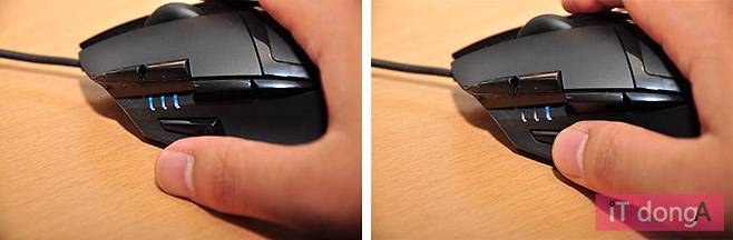 기계적인 성능 외에 사용성 부분에서도 FPS에 특화한 모습이다. G402의 전면 왼쪽에는 3개의 버튼이 있는데, 이를 통해 DPI(마우스 감도)를 조절할 수 있다. 눈에 띄는 기능은 DPI 할당 버튼, 일명 '저격 버튼'이다. 이 버튼을 누르고 있으면 사용자가 미리 지정한 DPI(기본 설정 시 400)로 바뀌며, 손가락을 떼면 원래 DPI로 돌아온다. 저격 버튼이라고 부르는 이유는 이 때문이다.