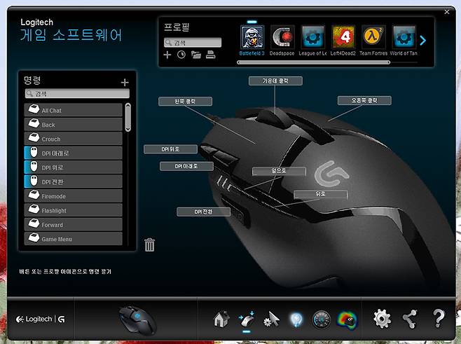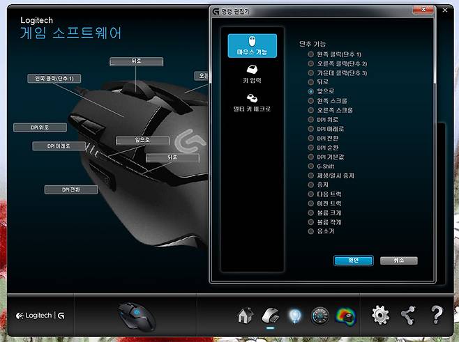 G402에는 총 8개의 버튼(스크롤 휠 포함)이 있다. 전용 소프트웨어를 사용하면 각각의 버튼에 기능을 할당할 수 있다. 클릭, 스크롤 등의 기본적인 마우스 기능은 물론, 일시정지, 이전곡, 다음곡 등 재생 관련 기능도 등록할 수 있다.