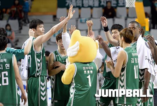 24일 원주 종합체육관에서 열린 2014-15 KCC 프로농구 원주 동부와 서울 SK의 경기에서 원주 동부가 서울 SK를 상대로 68대 56으로 승리를 거두었다. 동부 선수들이 코트에 모여 하이파이브를 하며 승리의 기쁨을 나누고있다. 저작권자 ⓒ 점프볼. 무단 전재-재배포 금지2014-10-24 신승규 기자( sks731001@hanmail.net)