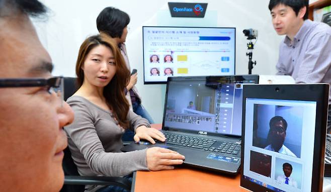 생체인식 보안기술의 발전으로 인식 속도와 인증 속도가 빨라지고 제품의 크기가 줄어들면서 사용처가 빠르게 늘어나고 있다. 얼굴인식 보안제품을 개발하는 네오시큐 연구원들이 움직이는 사람의 얼굴을 추적해 인식과 동시에 인증해주는 보안시스템을 시연해 보이고 있다.