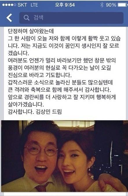 "사랑하는 사람을 만났습니다"라는 문구로 글을 시작한 김상민 의원은 "얼마 전까지만 해도 저란 사람이 결혼이란 걸 하게 될 줄은 꿈에도 몰랐다"며 "내가 (김)경란 씨와 결혼을 한다니 온통 인터넷이 떠들썩합니다"고 놀라운 반응을 보였다.