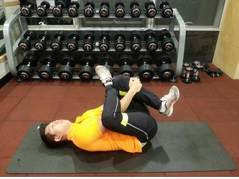 | 1. 양 무릎을 구부리고 눕는다.2. 한쪽 발목을 반대편 무릎위에 놓는다.3. 양손으로 무릎을 가슴으로 당긴다.4. 엉덩이 안쪽근육이 시원하게 당겨지는 느낌이 들 때까지만 늘린다. |