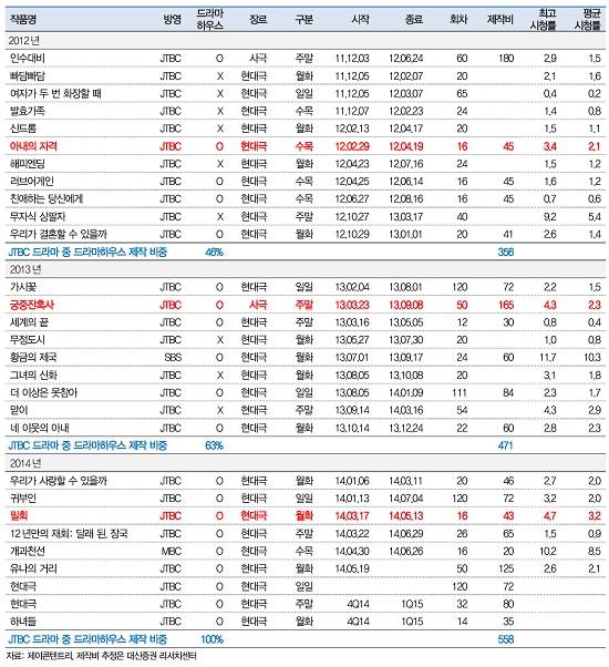 | 중앙일보가 소유한 드라마하우스는 국내 최대 드라마 제작사다. 드라마하우스가 제작한 '밀회'는 평균 시청률 3.2%를 기록했다. 드라마하우스는 지상파 드라마 제작도 많이 했지만 올해 JTBC에서 방영된 드라마는 100% 드라마하우스 작품이다. 그만큼 지상파 납품은 크게 줄었다. 중앙일보그룹의 재원을 JTBC에 쏟아붓고 있다는 이야기다. 표는 드라마하우스 제작 드라마 현황. ⓒ대신증권. | ||