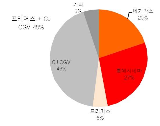 | 영화시장 점유율. CJ그룹 소속 CGV와 중앙일보그룹 소속 메가박스의 점유율을 더하면 70%에 육박한다. | ||