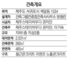 건물이 위치한 대지는 평균경사도가 약 12%인데다 바닥간 단차가 커 아무도 관심을 갖지 않던 '미운 오리' 땅이었다. 하지만 지형적 특성을 최대한 살려 건물을 짓고 나니 귤나무숲 너머 가파도와 마라도까지 조망할 수 있는 훌륭한 지형으로 변신했다.