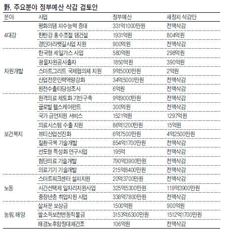 이 중 삭감 규모를 명시한 사업은 ▷평화의댐 치수능력증대 331억1000만원 전액삭감 ▷한탄강홍수조절댐건설 1931억원 중 804억원 삭감 ▷경인아라뱃길사업지원 900억원 전액삭감 등 2000억원이 넘는다.