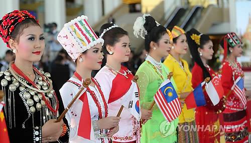 (네피도<미얀마>=연합뉴스) 도광환 기자 = 13일 오전 미얀마 국제회의센터(MICC)에서 열린 동아시아정상회의(EAS) 회의장 입구에 각국 국기를 든 미얀마 미녀들이 도열해 있다. 2014.11.13