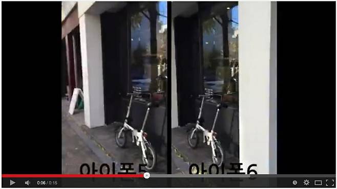 이 손떨림 보정이 얼마나 효과가 있을까요? 아이폰5와 아이폰6를 같은 기구에 고정해서 걸으며 동시 촬영했습니다. 확실히 아이폰6 쪽이 덜 흔들리는 느낌이 드네요.