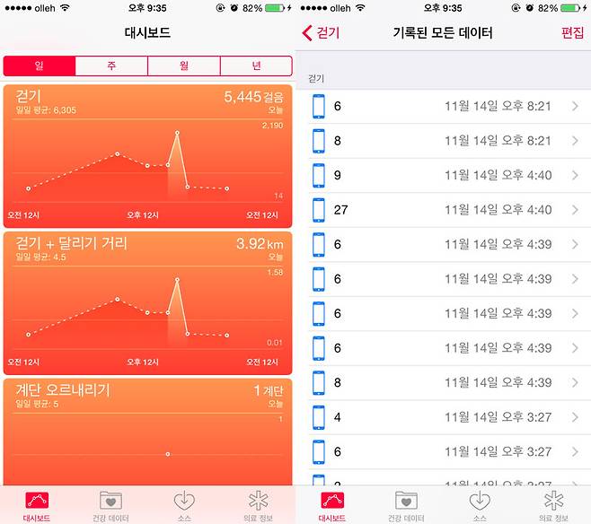 제가 신경쓰지 않아도 아이폰6는 제가 하루에 얼마나 걸었는지, 계단은 몇 번을 오르내렸는지 다 체크하고 있었더군요. 몇십 걸음을 걸으며 실험해보니 꽤 정확합니다. 섬뜩한 건 이걸 분단위로 세어 놓았습니다. 역시 애플답네요.