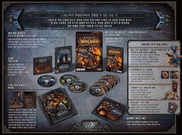 게임 내 주요 캐릭터 중 하나인 '그롬마쉬 헬스크림'의 원화로 장식된 이번 패키지에는 '월드 오브 워크래프트' 90일 무료 이용권과 함께 '드레노어의 전쟁군주 정식 버전 DVD', '개발 현장 뒷이야기가 담긴 DVD 및 블루레이 디스크 세트', '사운드트랙', '캐릭터 원화집', '블랙핸드 마우스 패드' 등 다양한 컨텐츠 및 상품들이 포함됐다.