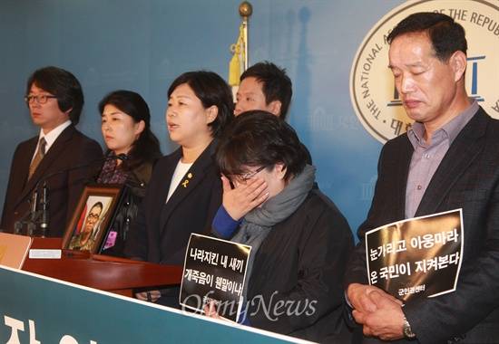 | ▲ 눈물 훔치는 윤일병-오대위 유가족 고 윤일병, 오대위 유가족들이 5일 국회 정론관에서 새정치민주연합 여성가족위원회, 야당 법제사법위원회 의원들과 함께 김흥석 육군법무실장 엄중 문책 및 고등군사법원장 내정철회를 촉구하며 눈물을 흘리고 있다. |