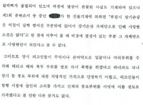 | ▲ 윤 일병 사건 1심재판부가 인용한 부검의 소견 윤 일병 사건 가해자들에 대한 1심 판결을 내린 3군사령부 보통군사법원 판결문에 따르면, 재판부는 국방부 조사본부 부검의의 부검감정서와 법정 증언을 인용해 가해자들에게 살인죄 적용이 어렵다고 봤다. |