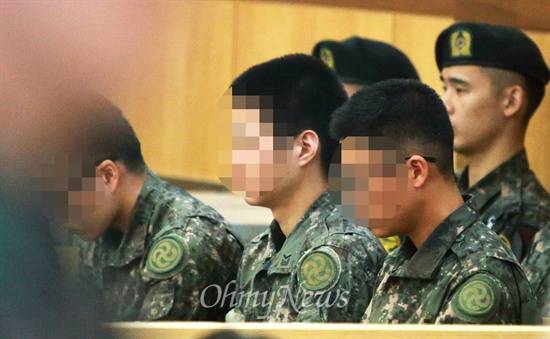 | ▲ 고개숙인 '윤일병 사망사건' 가해 병사들 9월 16일 오전 '윤일병 사망사건' 재판이 열리는 경기도 용인시 3군사령부 보통군사법원에서 가해 병사들이 피고인 석에 앉아 있다. |