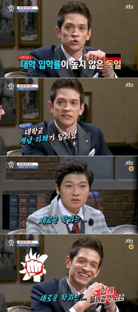 이날 독일 다니엘 린데만은 "독일은 명문대 개념이 없다. 전공별로 유명한 대학은 있다. 전문대 혹은 직업교육이다. 대학교 입학률이 그렇게 놓지 않다. 졸업율도 13%밖에 되지 않는다"고 말했다.